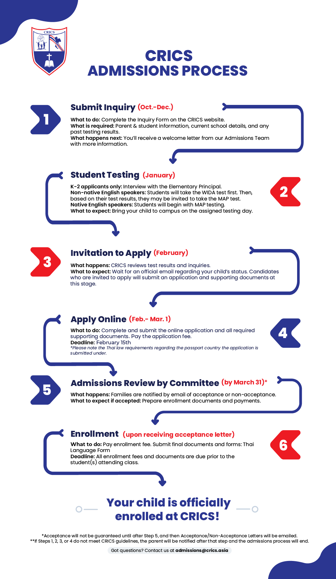 CRICS uses the WIDA MODEL, a standardized assessment tool. The current fee, for this assessment, is 1,500 baht per prospective student, and is payable on, or before the day of the scheduled assessment.